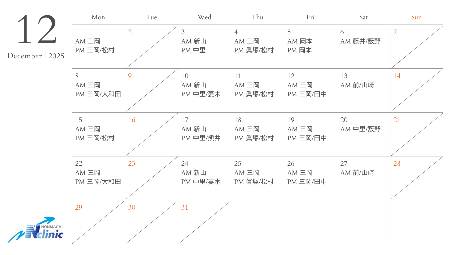 熊井医師による次回診察は12月6日(水)16:00~19:00です。