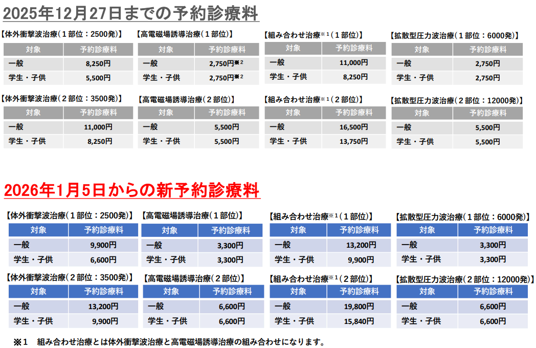 なお、体外衝撃波と組み合わせ治療をお勧めしていますが、体外衝撃波の費用は学生プロが2500発で5,000円(税別)、それ以外は3500発で10,000円(税別)となっています。